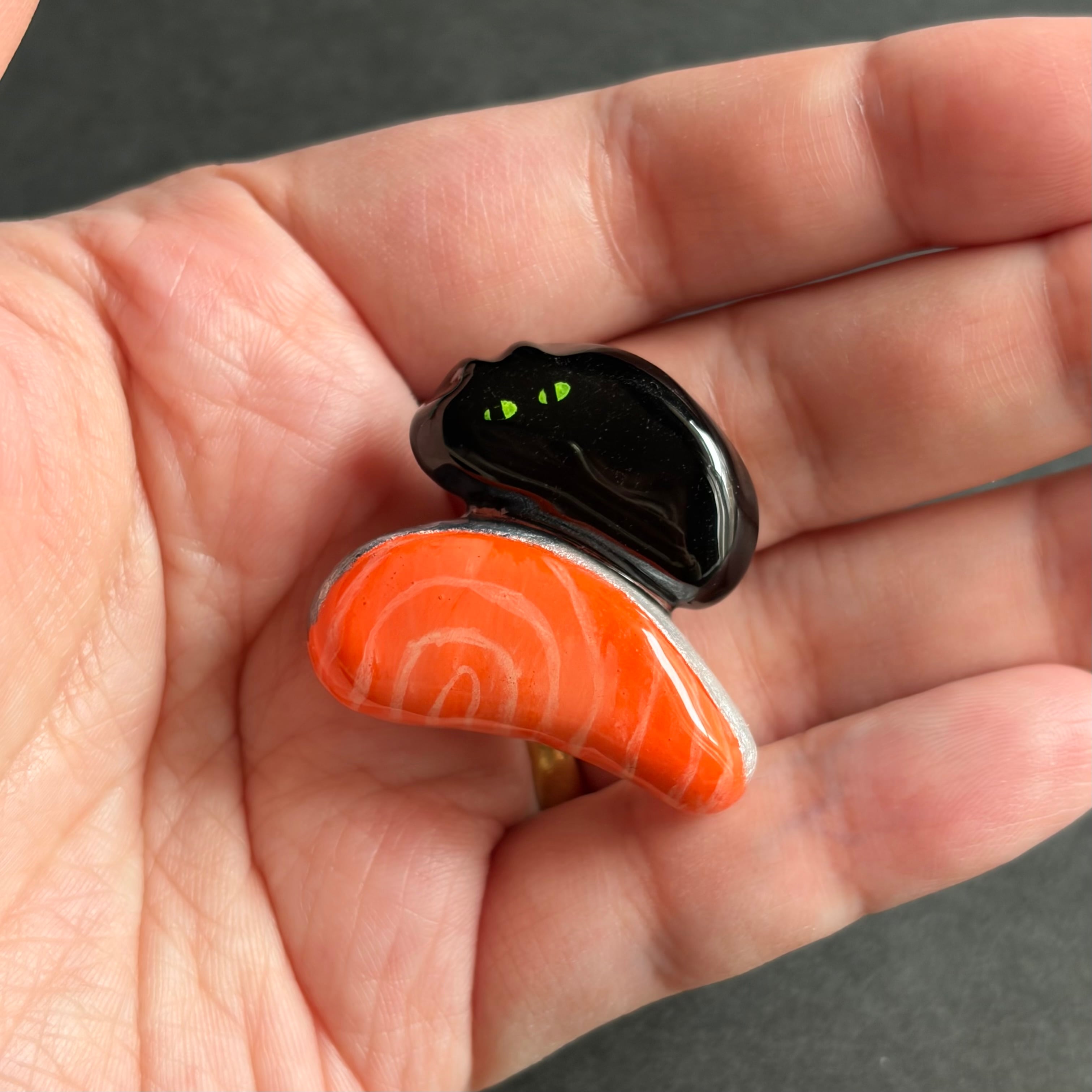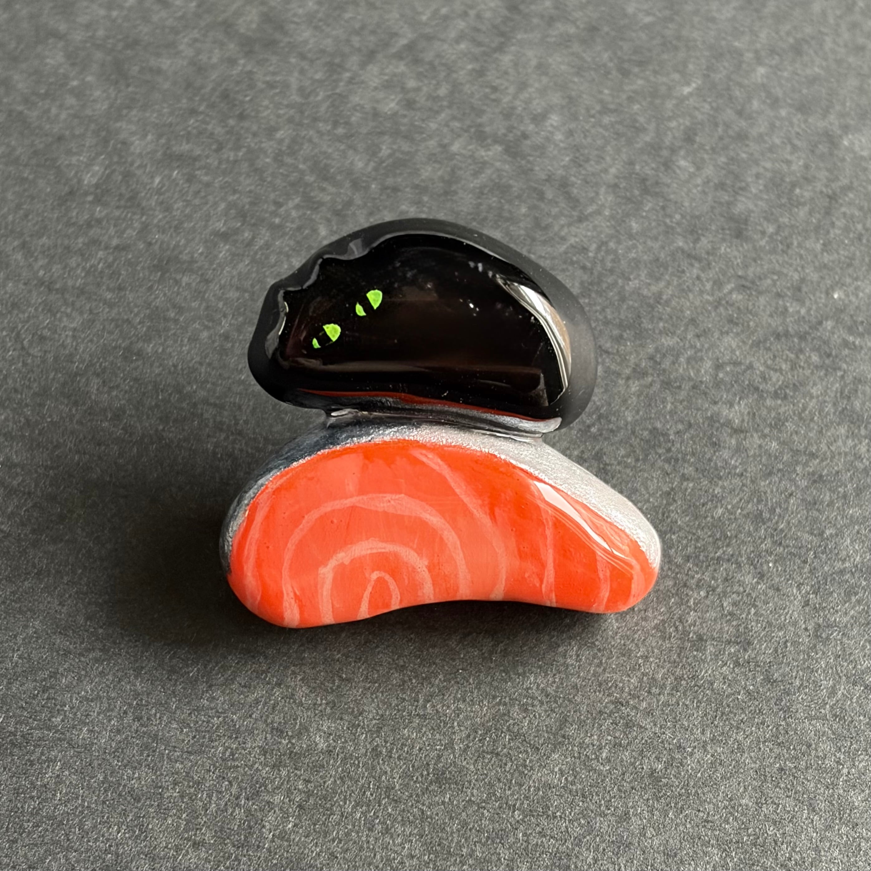 シャケ(切り身)を抱きしめるあやしいねこのブローチです。