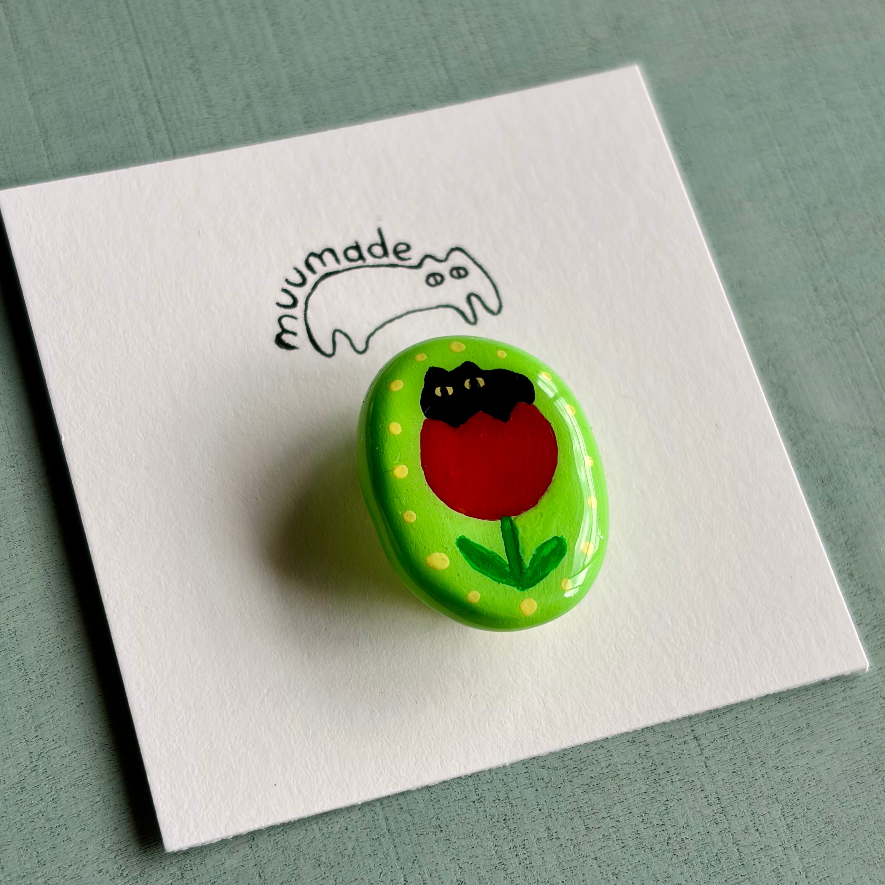 チューリップに乗って嬉しそうなあやしいねこの手描きブローチです。